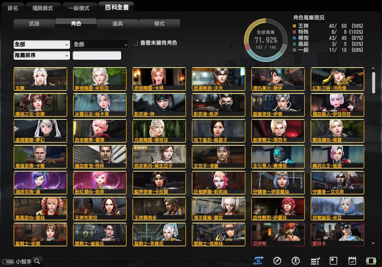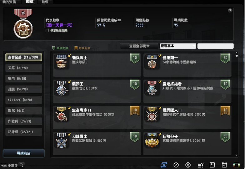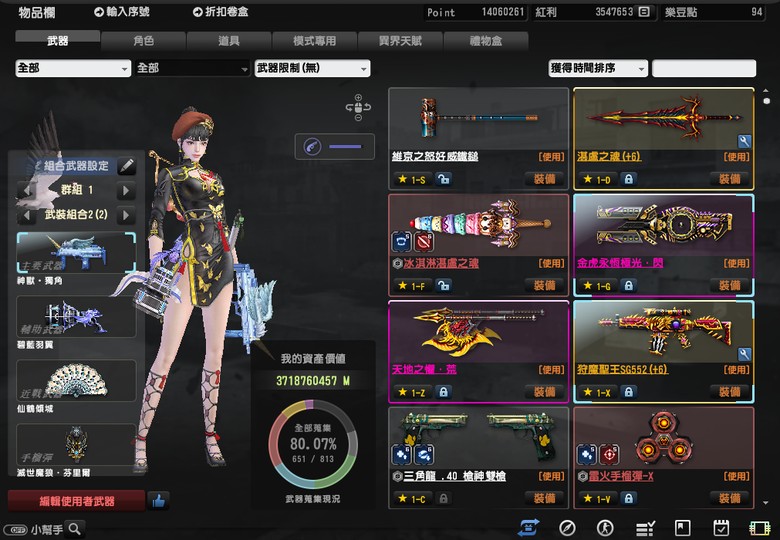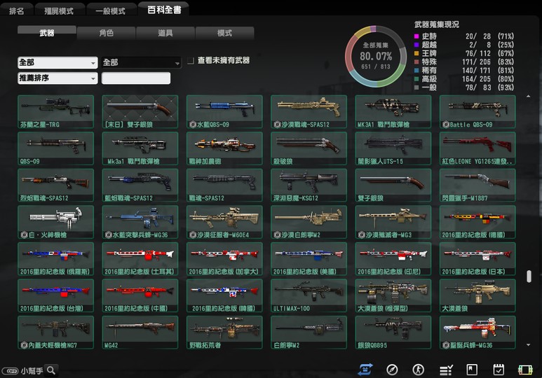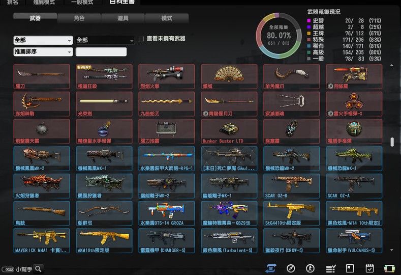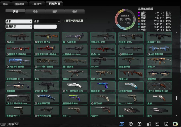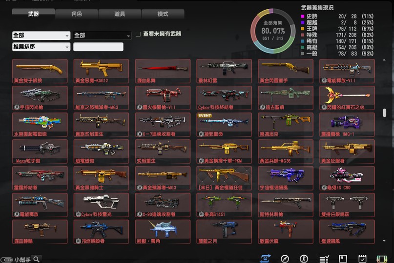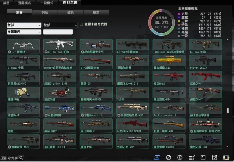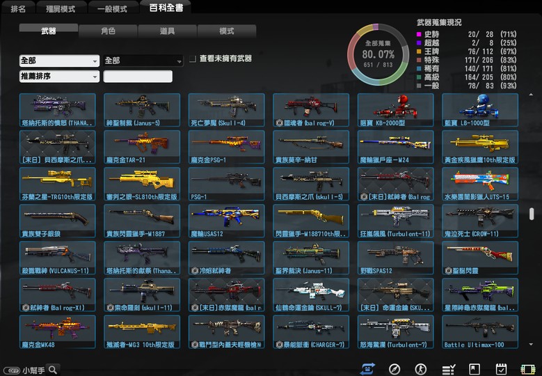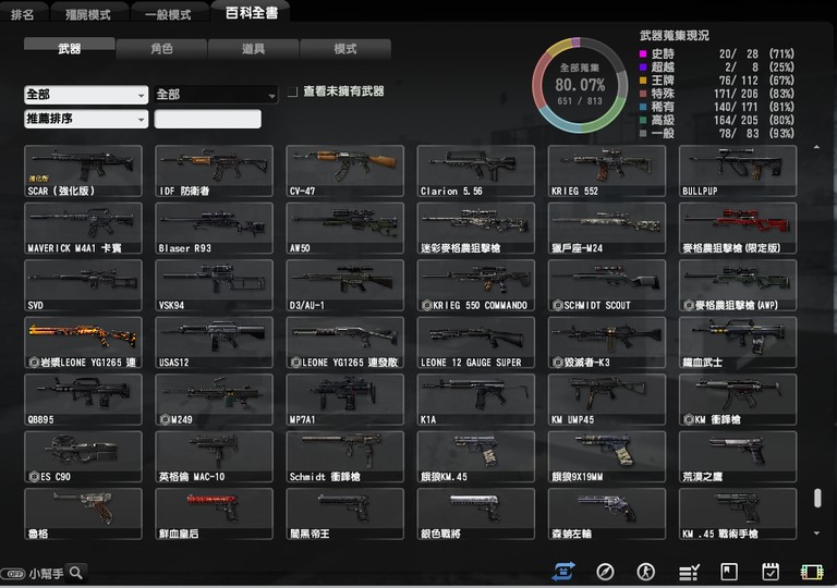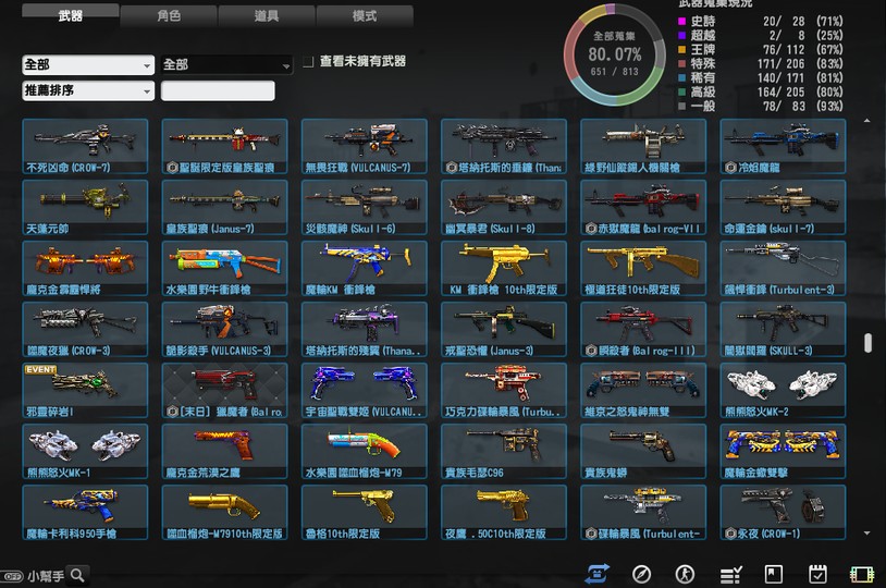 深紫色稱號 收集percentage 80.07 全部擁有的槍械,已是最高配置