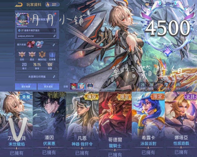 【Garena帳有綁定、鑽石、無VIP、29英、28造】刀鋒末世龍焰-五級、伏黑惠、神器