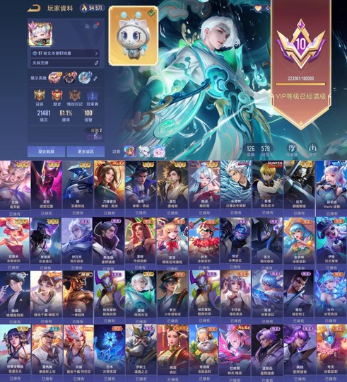 【Garena帳有綁定、永恆傳說、V10、126英、579造】英雄全滿金幣100萬以上,造型就圖片上,內有職業選手好友各種ss永恆好友