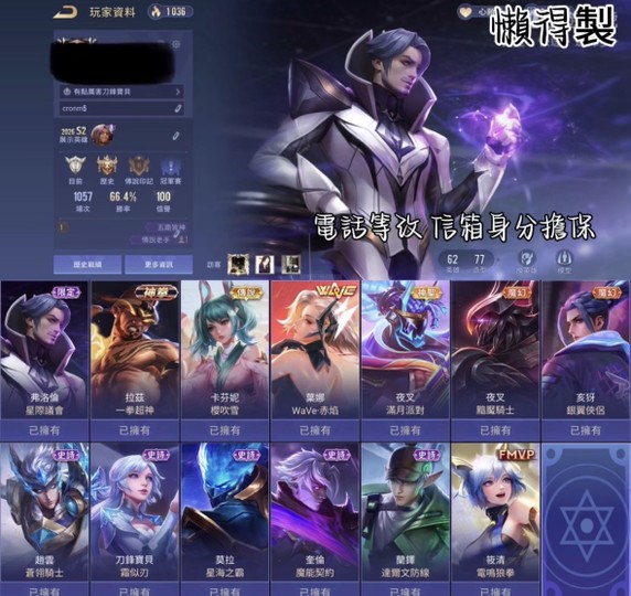 【Garena帳有綁定、鉑金、V5、62英、77造】洛倫星際、超神、櫻吹雪、wave赤焰、滿月派對、暗夜騎士、銀翼俠侶