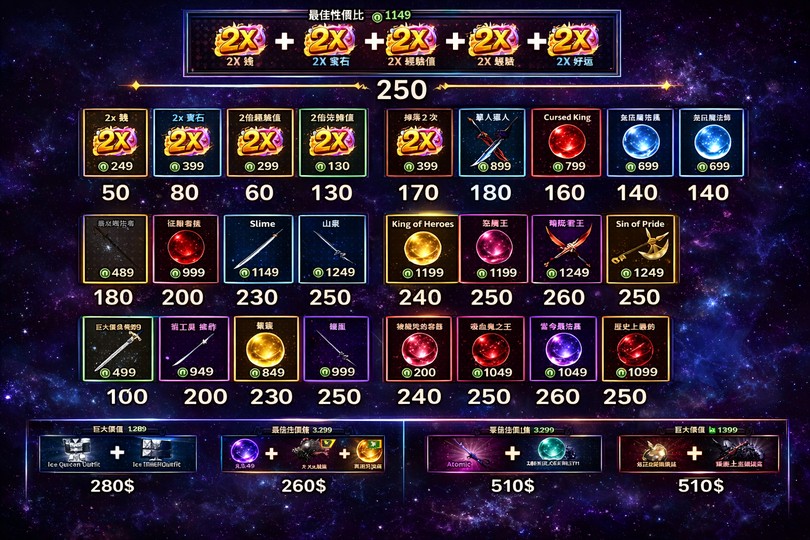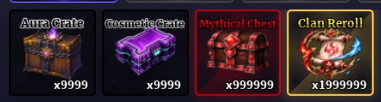 寶箱大禮包(aura crate*9999+cosmetic crate*9999+mythical chest*999999+clan+reroll*1999999) (+NT$2,500)