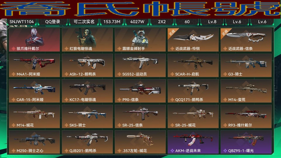 【OBSNJWT110442】總資產:153.73M,哈夫幣:4027W,傳說武器20,史詩武器20,武器皮膚185;烽火60級:鑽石Ⅳ,戰場:軍士長Ⅳ,【安全箱】進階安全箱;【特勤處等級】倉庫LV.8,靶場LV.6,訓練中心LV.6,收藏室LV.1,潛水中心LV.1;【捆綁包5】維什戴爾捆綁包,鵝鴨殺捆綁包,電鋸驚魂幹員捆綁包,緘花捆綁包,信條捆綁包;【幹員皮膚3】駭爪維什戴爾,紅狼電鋸驚魂,露娜金牌射手;【近戰皮膚3】近戰武器-憐憫,近戰武器-信條,近戰武器-黑鷹;【步槍皮膚79】M4A1突擊步槍-阿米婭,ASh-12戰鬥步槍-鵝鴨殺,SG552突擊步槍-運動員,SCAR-H戰鬥步槍-啟航,G3戰鬥步槍-騎士,CAR-15突擊步槍-阿米婭,KC17突擊步槍-電鋸驚魂,AKM突擊步槍-逆戰未來,QBZ95-1突擊步槍-曙光,ASh-12戰鬥步槍-無極限,K416突擊步槍-阿薩拉特攻,K416突擊步槍-冬日風情,K416突擊步槍-臘梅,AUG突擊步槍-蝮蛇,M7戰鬥步槍-百步穿楊,SG552突擊步槍-深海恐懼,SG552突擊步槍-哈夫克警備,G3戰鬥步槍-哈夫克警備,G3戰鬥步槍-流沙送葬,ASVal突擊步槍-百步穿楊,騰龍突擊步槍-獵鱷行動,K437突擊步槍-守護者;【衝鋒槍皮膚36】P90衝鋒槍-信條,QCQ171衝鋒槍-鵝鴨殺,MP5衝鋒槍-戰術競備,MP5衝鋒槍-競技風,Vector衝鋒槍-百步穿楊,SR-3M緊湊突擊步槍-戰術競備,勇士衝鋒槍-深海恐懼,勇士衝鋒槍-工業狂潮,MP7衝鋒槍-守護者,MP7衝鋒槍-六套之力;【射手步槍皮膚21】M14射手步槍-蠻荒,M14射手步槍-緘花,SKS射手步槍-騎士,SR-25射手步槍-信條,SR-25射手步槍-緘花,Mini-14射手步槍-守護者,VSS射手步槍-叢影諜蹤,M14射手步槍-工業狂潮;【狙擊步槍皮膚11】R93狙擊步槍-維什戴爾,SV-98狙擊步槍-獵鱷行動,M700狙擊步槍-百步穿楊,AWM狙擊步槍-無極限,AWM狙擊步槍-流沙送葬;【輕機槍皮膚13】M250通用機槍-騎士之心,QJB201輕機槍-鵝鴨殺,M249輕機槍-叢影諜蹤,QJB201輕機槍-熾焰;【手槍皮膚13】.357左輪-緘花,沙漠之鷹-曙光;【復合弓皮膚1】復合弓-守護者;【掛飾25】三足蟾,赤霄游龍,掛飾-蝕金玫瑰,掛飾-維什戴爾,掛飾-信條,掛飾-龍門幣,儀典匕首,牛角,掛飾-大白鵝,關山難越,掛飾-啟程,掛飾-雪人,掛飾-卡皮巴拉,掛飾-緘花,阿薩拉狙擊兵,阿薩拉霰彈兵,詭影狙擊兵,詭影噴火兵,暗行哨兵,崩巖重炮,福祿,聚寶盆;【載具15】輪式突擊炮-榮耀,M1A4坦克-馴鹿,輪式突擊炮-巔峰競賽,M1A4坦克-巔峰競賽,突擊直升機-原始偽裝,全地形車-森林迷彩,M1A4坦克-護林人,輪式突擊炮-護林人,M1A4坦克-煙火2026,GTQ35坦克-煙火2026,突擊車-寒梅,輪式突擊炮-煙火2026,F45A戰鬥機-夜間迷彩,偵察直升機-煙火2026,F-45A戰鬥機-建造;【烽火地帶戰損比】2.4/0.8/0.9;【貨幣】94三角幣,253三角卷,【 皮膚、道具、貨幣、安全箱、特勤處等實際資訊請以遊戲內資料為準】【QQ登入】【可二次實名】【官方截圖】