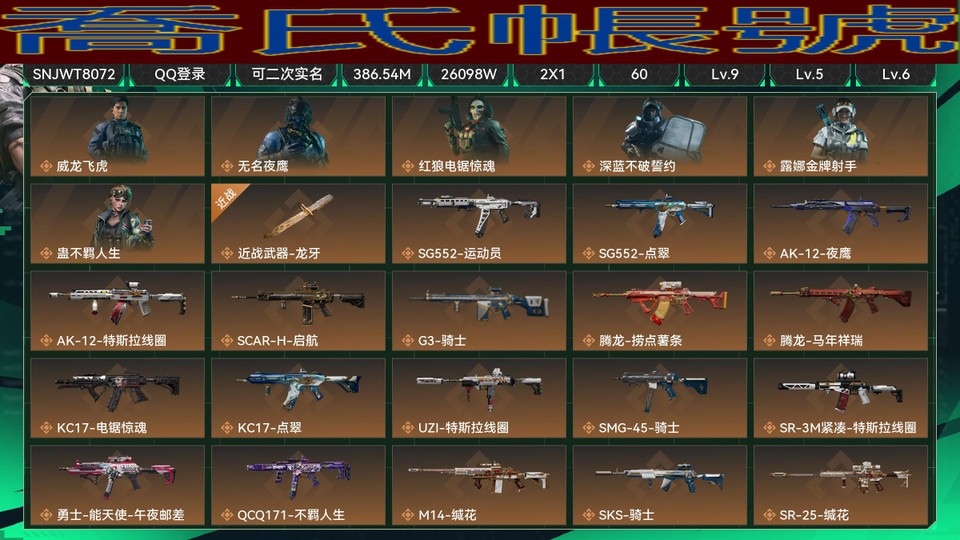 【OBSNJWT807242】總資產:386.54M,哈夫幣:26098W,傳說武器27,史詩武器27,武器皮膚267;烽火60級:鑽石Ⅰ,戰場:暫無段位,【安全箱】基礎安全箱;【特勤處等級】倉庫LV.9,靶場LV.5,訓練中心LV.6,收藏室LV.1,潛水中心LV.2;【捆綁包8】飛虎捆綁包,電鋸驚魂幹員捆綁包,點翠捆綁包,特斯拉線圈捆綁包,撈點薯條捆綁包,緘花捆綁包,曙光捆綁包,精密維護捆綁包;【幹員皮膚6】威龍飛虎,無名夜鷹,紅狼電鋸驚魂,深藍不破誓約,露娜金牌射手,蠱不羈人生;【近戰皮膚2】近戰武器-龍牙,近戰武器-黑鷹;【步槍皮膚109】SG552突擊步槍-運動員,SG552突擊步槍-點翠,AK-12突擊步槍-夜鷹,AK-12突擊步槍-特斯拉線圈,SCAR-H戰鬥步槍-啟航,G3戰鬥步槍-騎士,騰龍突擊步槍-撈點薯條,騰龍突擊步槍-馬年祥瑞,KC17突擊步槍-電鋸驚魂,KC17突擊步槍-點翠,AK-12突擊步槍-原型機,AKM突擊步槍-林中獵手,QBZ95-1突擊步槍-曙光,ASh-12戰鬥步槍-守夜人,ASh-12戰鬥步槍-無極限,K416突擊步槍-冬日風情,K416突擊步槍-緘默情歌,M16A4突擊步槍-競賽選手,AUG突擊步槍-瑰麗風尚,M7戰鬥步槍-百步穿楊,SG552突擊步槍-尖端治療,G3戰鬥步槍-精密維護,G3戰鬥步槍-哈夫克警備,G3戰鬥步槍-流沙送葬,PTR-32突擊步槍-英雄,ASVal突擊步槍-尖端治療,ASVal突擊步槍-精密維護,ASVal突擊步槍-典獄官,ASVal突擊步槍-百步穿楊,騰龍突擊步槍-聚光燈,K437突擊步槍-守護者,KC17突擊步槍-緘默情歌;【衝鋒槍皮膚60】UZI衝鋒槍-特斯拉線圈,SMG-45衝鋒槍-騎士,SR-3M緊湊突擊步槍-特斯拉線圈,勇士衝鋒槍-能天使-午夜郵差,QCQ171衝鋒槍-不羈人生,MP5衝鋒槍-戰術競備,MP5衝鋒槍-競技風,Vector衝鋒槍-百步穿楊,SR-3M緊湊突擊步槍-戰術競備,勇士衝鋒槍-深海恐懼,勇士衝鋒槍-工業狂潮,MP7衝鋒槍-守護者,MP7衝鋒槍-六套之力,QCQ171衝鋒槍-精密維護;【射手步槍皮膚31】M14射手步槍-緘花,SKS射手步槍-騎士,SR-25射手步槍-緘花,PSG-1射手步槍-點翠,Mini-14射手步槍-守護者,SVD狙擊步槍-阿薩拉工藝,SVD狙擊步槍-暗夜獵手,M14射手步槍-工業狂潮,SR-25射手步槍-尖端治療;【狙擊步槍皮膚19】AWM狙擊步槍-撈點薯條,SV-98狙擊步槍-林中獵手,SV-98狙擊步槍-囚徒,M700狙擊步槍-競技風,M700狙擊步槍-蝮蛇,M700狙擊步槍-守夜人,M700狙擊步槍-哈夫克警備,M700狙擊步槍-百步穿楊,AWM狙擊步槍-無極限,AWM狙擊步槍-流沙送葬;【霰彈槍皮膚11】M1014霰彈槍-林中獵手,S12K霰彈槍-曙光;【輕機槍皮膚18】M250通用機槍-騎士之心,PKM通用機槍-英雄,PKM通用機槍-守夜人,QJB201輕機槍-OldHabits,QJB201輕機槍-熾焰;【手槍皮膚15】.357左輪-緘花,G18-飛虎,G18-馬年祥瑞,93R-撈點薯條,沙漠之鷹-曙光;【復合弓皮膚2】復合弓-黑-天際線,復合弓-守護者;【掛飾36】掛飾-蝕金玫瑰,掛飾-黑,掛飾-維什戴爾,麥小鼠,掛飾-彩蛋,掛飾-小羊,掛飾-特斯拉線圈,掛飾-阿米婭,掛飾-來點薯條,關山難越,掛飾-啟程,掛飾-雪人,雪松,湯圓,北非蛋,餃子,馬到成功,掛飾-點翠,掛飾-緘花,持盾者,重灌記者,演出導演,阿薩拉狙擊兵,阿薩拉霰彈兵,詭影狙擊兵,暗行哨兵,崩巖重炮,福祿,聚寶盆;【載具36】步戰車-無瑕,步戰車--克蘇魯,輪式突擊炮-暗夜行動,輪式突擊炮-凝視,輪式突擊炮-榮耀,M1A4坦克-馴鹿,突擊直升機-颶風行動,偵察直升機-凝視,突擊直升機-暗夜行動,防空車-獵虎,輪式突擊炮-獵虎,M1A4坦克-破碎,步戰車-破碎,防空車-破碎,步戰車-生命線,防空車-生命線,M1A4坦克-哈夫克重工,輪式突擊炮-巔峰競賽,M1A4坦克-巔峰競賽,偵察直升機-酒紅,突擊直升機-原始偽裝,突擊車-沙漠迷彩,M1A4坦克-赤色軍團,步戰車-赤色軍團,防空車-赤色軍團,M1A4坦克-護林人,輪式突擊炮-護林人,M1A4坦克-煙火2026,GTQ35坦克-煙火2026,突擊車-寒梅,輪式突擊炮-煙火2026,高雅黑-主戰坦克,突擊直升機-赤色軍團,F45A戰鬥機-夜間迷彩,偵察直升機-煙火2026,F-45A戰鬥機-建造;【AW子彈】135;【烽火地帶戰損比】1.5/0.9/0.7;【貨幣】28三角幣,80三角卷,【 皮膚、道具、貨幣、安全箱、特勤處等實際資訊請以遊戲內資料為準】【QQ登入】【可二次實名】【官方截圖】賣號了不玩遊戲了因為**需要錢動手術**動手術只能賣了現在在浙江東陽支援**可轉號純[綠圓]號從未違規有135發AW和8甲8頭六套倉庫咖啡豆無數限定炫彩紅可**驗號!!! 感興趣的話點我想要和我**吧~