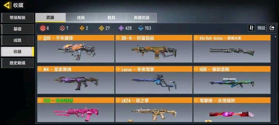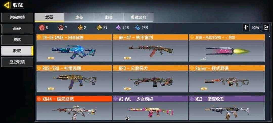 7把神話槍6把滿,有紅蓮滿。電狙唐刀。2隻紅角1橙