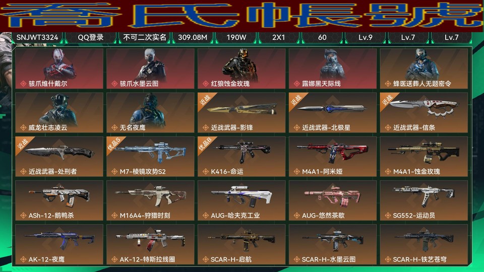 【OBSNJWT332442】總資產:309.08M,哈夫幣:190W,傳說武器55,史詩武器55,武器皮膚333;烽火60級:鑽石Ⅲ,戰場:軍士長Ⅳ,【安全箱】基礎安全箱;【特勤處等級】倉庫LV.9,靶場LV.7,訓練中心LV.7,收藏室LV.1,潛水中心LV.3;【捆綁包13】影鋒捆綁包,北極星捆綁包,維什戴爾捆綁包,鵝鴨殺捆綁包,蝕金玫瑰捆綁包,黑天際線捆綁包,狩獵時刻捆綁包,悠然茶歇捆綁包,特斯拉線圈捆綁包,萬金淚冠捆綁包,緘花捆綁包,信條捆綁包,蝮蛇捆綁包;【幹員皮膚11】駭爪維什戴爾,駭爪水墨雲圖,紅狼蝕金玫瑰,露娜黑天際線,蜂醫送葬人無題密令,威龍壯志凌雲,無名夜鷹,深藍不破誓約,烏魯魯荒原獵手,露娜金牌射手,蠱不羈人生;【傳說典藏皮膚2】M7戰鬥步槍-稜鏡攻勢S2(優品S),K416突擊步槍-命運(優品B);【近戰皮膚5】近戰武器-影鋒,近戰武器-北極星,近戰武器-信條,近戰武器-處刑者,近戰武器-黑鷹;【步槍皮膚131】K416突擊步槍-命運,M7戰鬥步槍-稜鏡攻勢S2,M4A1突擊步槍-阿米婭,M4A1突擊步槍-蝕金玫瑰,ASh-12戰鬥步槍-鵝鴨殺,M16A4突擊步槍-狩獵時刻,AUG突擊步槍-哈夫克工業,AUG突擊步槍-悠然茶歇,SG552突擊步槍-運動員,AK-12突擊步槍-夜鷹,AK-12突擊步槍-特斯拉線圈,SCAR-H戰鬥步槍-啟航,SCAR-H戰鬥步槍-水墨雲圖,SCAR-H戰鬥步槍-鐵藝蒼穹,SCAR-H戰鬥步槍-荼蘼,G3戰鬥步槍-狩獵時刻,CAR-15突擊步槍-阿米婭,CAR-15突擊步槍-黑鷹墜落,騰龍突擊步槍-馬年祥瑞,騰龍突擊步槍-萬金淚冠,K437突擊步槍-北極星,MK47突擊步槍-悠然茶歇,M4A1突擊步槍-特勤執行,AKM突擊步槍-林中獵手,AKM突擊步槍-逆戰未來,QBZ95-1突擊步槍-ACE,ASh-12戰鬥步槍-守夜人,ASh-12戰鬥步槍-無極限,K416突擊步槍-冬日風情,K416突擊步槍-臘梅,M16A4突擊步槍-競賽選手,AUG突擊步槍-戰術迷彩,AUG突擊步槍-蝮蛇,AUG突擊步槍-特勤執行,M7戰鬥步槍-百步穿楊,SG552突擊步槍-尖端治療,SG552突擊步槍-深海恐懼,SG552突擊步槍-哈夫克警備,SCAR-H戰鬥步槍-囚徒,G3戰鬥步槍-戰場英傑,G3戰鬥步槍-流沙送葬,PTR-32突擊步槍-ACE,PTR-32突擊步槍-英雄,ASVal突擊步槍-尖端治療,ASVal突擊步槍-典獄官,ASVal突擊步槍-百步穿楊,騰龍突擊步槍-無垢,騰龍突擊步槍-獵鱷行動,K437突擊步槍-守護者,K437突擊步槍-叢影諜蹤;【衝鋒槍皮膚78】P90衝鋒槍-信條,Vector衝鋒槍-狩獵時刻,Vector衝鋒槍-能天使-午夜郵差,UZI衝鋒槍-特斯拉線圈,UZI衝鋒槍-悠然茶歇,SMG-45衝鋒槍-騎士,SR-3M緊湊突擊步槍-特斯拉線圈,SR-3M緊湊突擊步槍-荼蘼,勇士衝鋒槍-能天使-午夜郵差,勇士衝鋒槍-萬金淚冠,QCQ171衝鋒槍-北極星,QCQ171衝鋒槍-鵝鴨殺,QCQ171衝鋒槍-不羈人生,MP5衝鋒槍-深海恐懼,MP5衝鋒槍-戰術競備,MP5衝鋒槍-競技風,P90衝鋒槍-緊急戒備,Vector衝鋒槍-阿薩拉文明,Vector衝鋒槍-紅色彗星,Vector衝鋒槍-獵鱷行動,Vector衝鋒槍-百步穿楊,SR-3M緊湊突擊步槍-荒野求生,SR-3M緊湊突擊步槍-戰術競備,SR-3M緊湊突擊步槍-開工大吉,勇士衝鋒槍-深海恐懼,勇士衝鋒槍-工業狂潮,勇士衝鋒槍-叢影諜蹤,MP7衝鋒槍-無垢,MP7衝鋒槍-守護者,MP7衝鋒槍-六套之力;【射手步槍皮膚37】M14射手步槍-蠻荒,M14射手步槍-緘花,SKS射手步槍-騎士,SR-25射手步槍-信條,SR-25射手步槍-緘花,Mini-14射手步槍-守護者,VSS射手步槍-叢影諜蹤,SVD狙擊步槍-阿薩拉工藝,SVD狙擊步槍-暗夜獵手,SVD狙擊步槍-荒野求生,M14射手步槍-黑鷹墜落,M14射手步槍-禁衛,SKS射手步槍-ACE,SR-25射手步槍-尖端治療,PSG-1射手步槍-無垢;【狙擊步槍皮膚22】R93狙擊步槍-維什戴爾,AWM狙擊步槍-影鋒,AWM狙擊步槍-萬金淚冠,SV-98狙擊步槍-林中獵手,SV-98狙擊步槍-囚徒,SV-98狙擊步槍-獵鱷行動,M700狙擊步槍-競技風,M700狙擊步槍-蝮蛇,M700狙擊步槍-守夜人,M700狙擊步槍-百步穿楊,AWM狙擊步槍-無極限,AWM狙擊步槍-流沙送葬;【霰彈槍皮膚16】M1014霰彈槍-影鋒,725雙管霰彈槍-送葬人-無題密令,M1014霰彈槍-林中獵手,M1014霰彈槍-沉寂,S12K霰彈槍-曙光;【輕機槍皮膚27】PKM通用機槍-荼蘼,M250通用機槍-騎士之心,QJB201輕機槍-鵝鴨殺,PKM通用機槍-蝮蛇,PKM通用機槍-英雄,PKM通用機槍-守夜人,PKM通用機槍-荒野求生,M249輕機槍-叢影諜蹤,M250通用機槍-囚徒,QJB201輕機槍-OldHabits,QJB201輕機槍-熾焰;【手槍皮膚15】.357左輪-緘花,G18-馬年祥瑞,.357左輪-幸運時刻,沙漠之鷹-曙光;【復合弓皮膚2】復合弓-黑-天際線,復合弓-守護者;【掛飾43】麥小鼠,祥龍,三足蟾,掛飾-蝕金玫瑰,掛飾-影鋒,掛飾-黑,掛飾-維什戴爾,掛飾-北極星,掛飾-信條,掛飾-凌霄戍衛,掛飾-磁吸炸彈,掛飾-槍匠,掛飾-王牌座駕,掛飾-彩蛋,掛飾-小羊,掛飾-狩獵時刻,掛飾-特斯拉線圈,掛飾-阿米婭,掛飾-晶石幻想,掛飾-大白鵝,關山難越,掛飾-啟程,掛飾-雪人,掛飾-悠然茶歇,湯圓,北非蛋,餃子,掛飾-卡皮巴拉,掛飾-荼蘼,馬到成功,掛飾-緘花,掛飾-萬金淚冠,掛飾-不羈人生,詭影狙擊兵,詭影噴火兵,暗行哨兵,崩巖重炮,福祿,聚寶盆;【安全箱皮膚】零號玩家;【載具77】M1A4坦克-叢林獵手,輪式突擊炮-域外狂徒,步戰車-無瑕,M1A4坦克-黑騎士,步戰車-黑騎士,防空車-黑騎士,步戰車-卦象,防空車-卦象,步戰車--克蘇魯,防空車-凝視,輪式突擊炮-暗夜行動,輪式突擊炮-凝視,M1A4坦克-烈焰,輪式突擊炮-紫電,防空車-警戒線,M1A4坦克-紫電,全地形車-警戒線,步戰車-移動堡壘,防空車-移動堡壘,輪式突擊炮-榮耀,M1A4坦克-移動堡壘,輪式突擊炮-移動堡壘,GTQ35坦克-移動堡壘,M1A4坦克-馴鹿,突擊直升機-颶風行動,偵察直升機-卦象,突擊直升機-黑騎士,