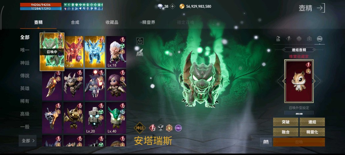 ★變身:阿斯特洛(+1重複)+凱伊奧斯(+1重複)超突滿(差1屠龍可70%合青變)、4金(女金老頭獸金依勒超+突)、紫缺3(全超27突)、紅缺2滿(其餘超突滿),有最新的3隻三國角色(全部超突滿),4金石12紫石