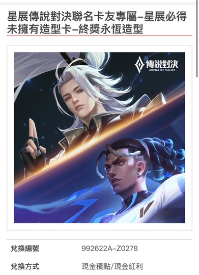 傳說對決永恆造型兌換卡 星展銀行刷卡禮