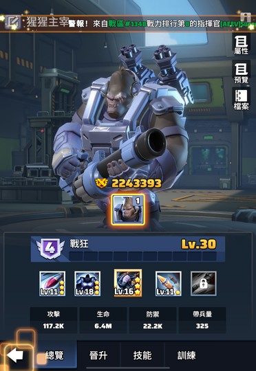 核心戰力: 飛機進度達 41.87。猩猩主宰戰力達四等,具備極佳的基礎與發展潛力。