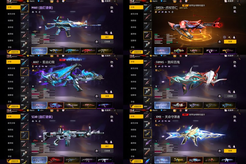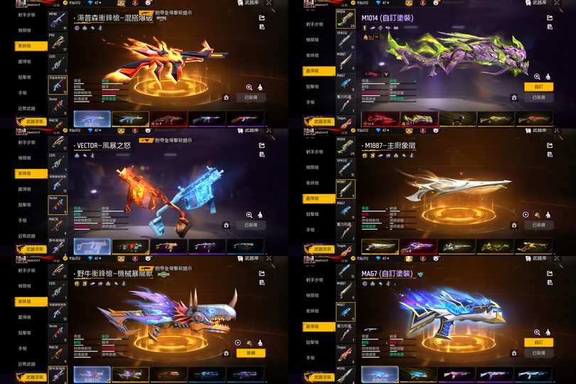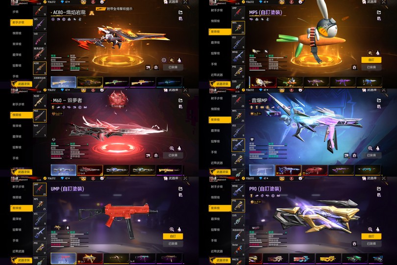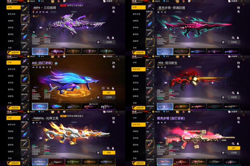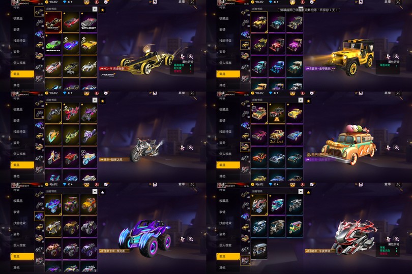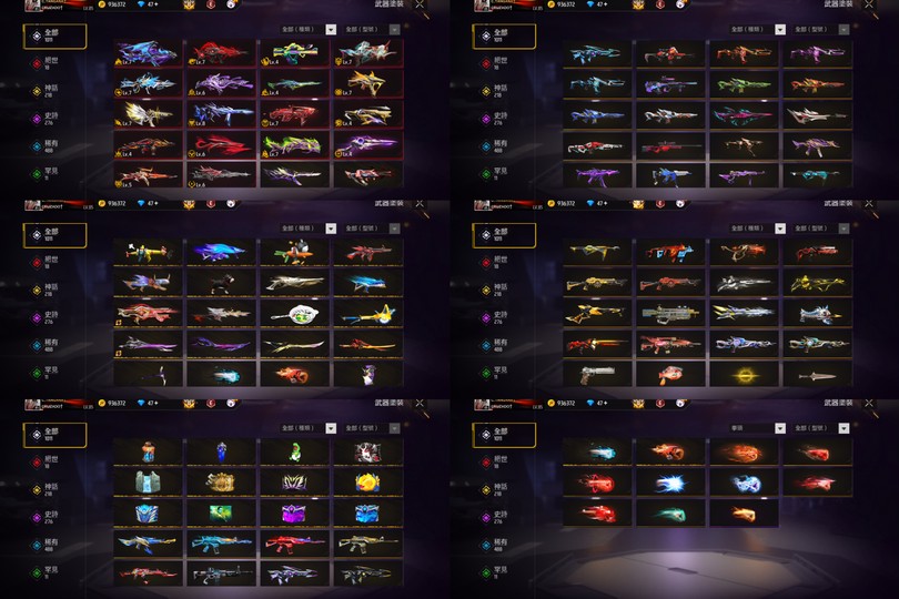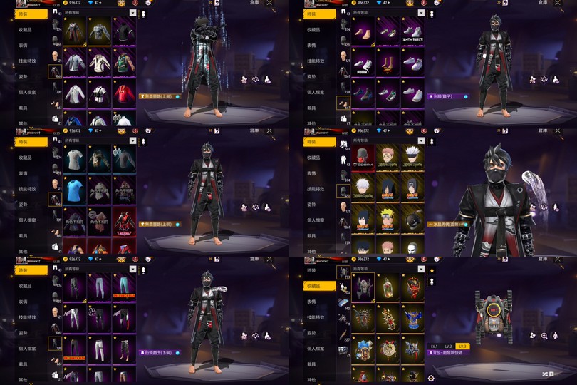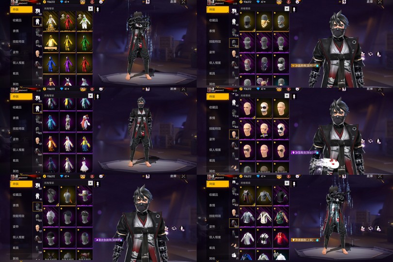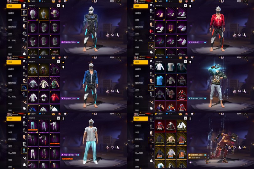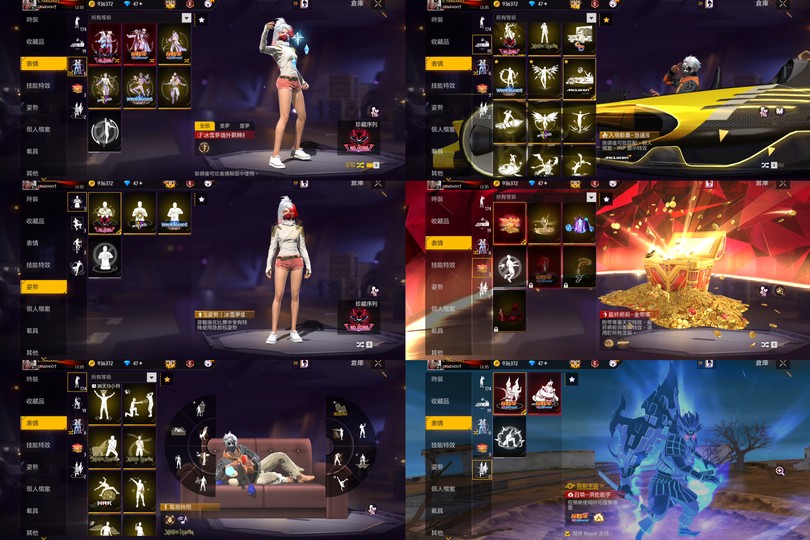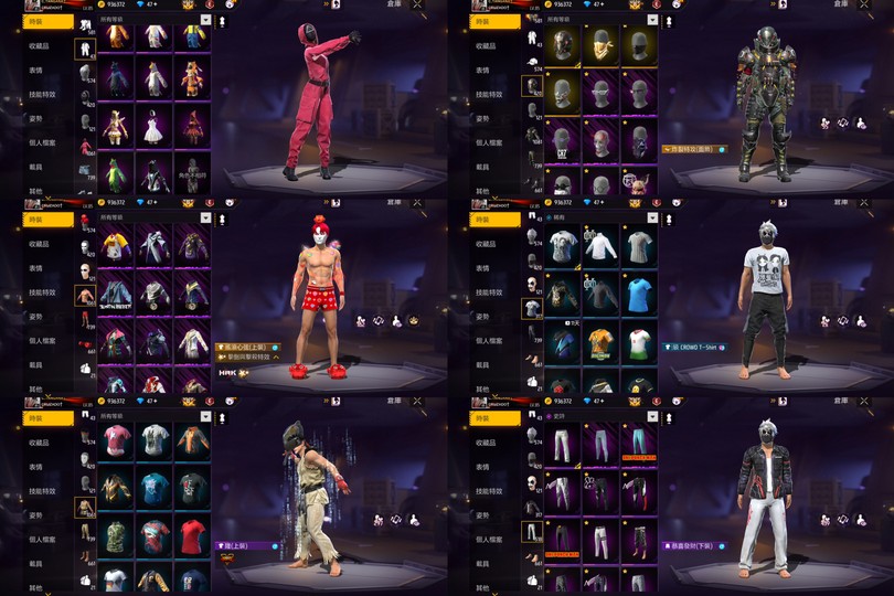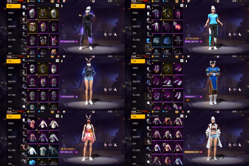 女:小舞,機甲頭都有,月光之金,女刺客,潛伏倩影,青年才俊,紫藍白天人,海豹、熊貓套裝,純陰子、純陽碧璽、陰陽水晶、雨夜殺機…